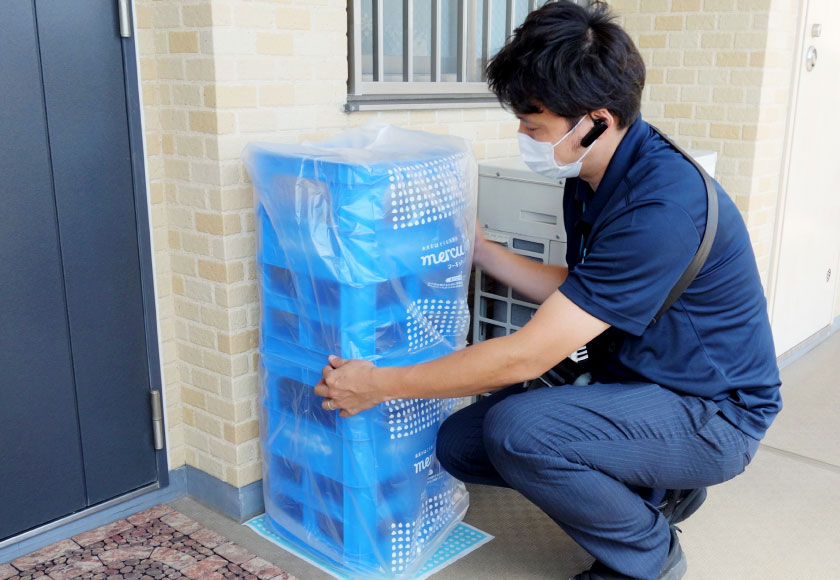 ご不在のお客様の玄関先に「置き配」する際は、ケースの底が汚れないよう“まごころシート”を敷き、ボトルとケースを覆う袋をかけて納品します。雨天時も天然水ボトルとケースが濡れるのを防ぎます。さらに2023年より、袋の素材を薄くし、約40%軽量化、プラ削減に取り組んでいます。