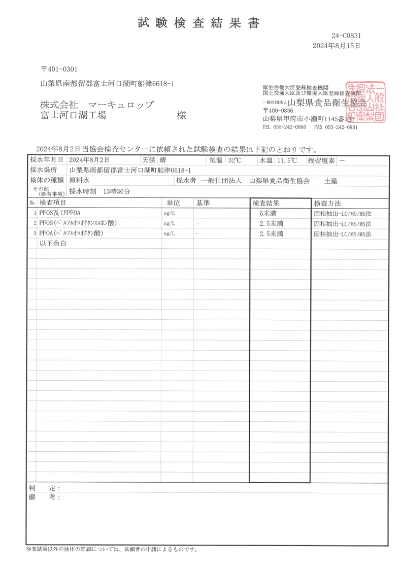 第三者機関にて年に2回、PFASの検査を実施しております。また工場では毎月、自主検査を行っております。