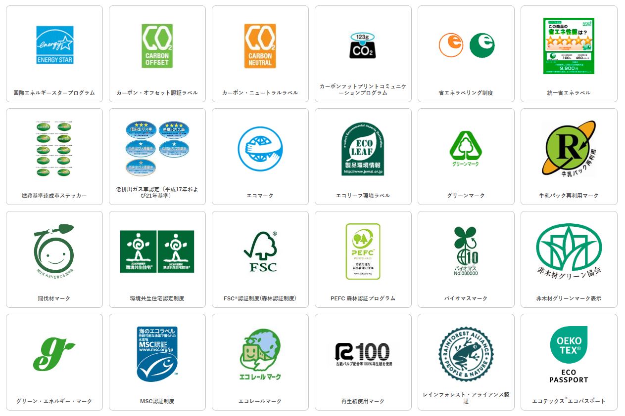 日本国内の、国や第三者機関による主な環境ラベルはこちらです。この他にもあります。