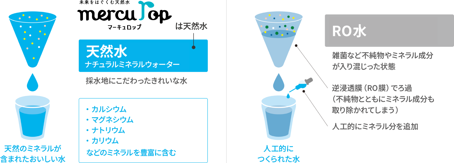 天然水、RO水、浄水の中から、食の好みやこだわりに合うものを選びます。ミネラルウォーターをペットボトルで購入して飲んでいた方にとっては「天然水」が同等品質の水(品名「ナチュラルミネラルウォーター」表記のできる水)です。