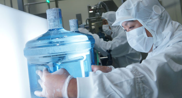 洗浄されたボトルに、生産ラインで生産された富士山の天然水が充填され、お客様のもとに届けられます。