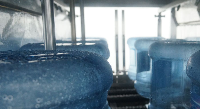 ここまでの検査に合格したボトルだけを、14工程の洗浄殺菌を行い使用します。最後に天然水ですすぎ(共洗い)をして、ボトルの準備は完了です。